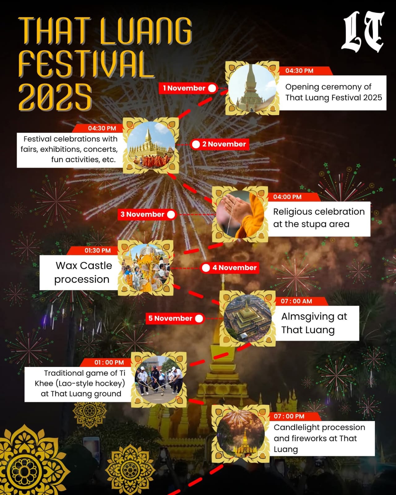 1 semaine après le grand festival de l’Artisanat Lao, cette fête qui s’articule autour du Stupa jaune (le That Luang) et réunit aussi bien ceux venus pour des raisons religieuses que dans un but plus profane de divertissement (la quasi-totalité des Laotiens mêlant sans encombre l’un et l’autre). Ainsi, durant la journée sont exposés des stands réunissant les pays de l’ASEAN (Association of Southeast Asian Nations) désirant communiquer sur le tourisme, ainsi que des marchands de toute sorte.