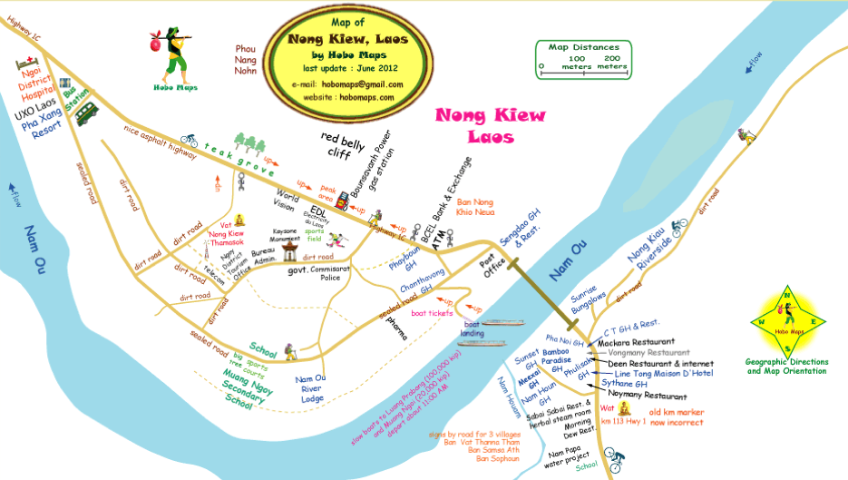 150km up north Luang Prabang on the road # 13, the peaceful village of Nong Khiaw (also called Mouang Ngoi Khoua). This village is about 4000 inhabitants, and developed around the bridge that straddles the Nam Ou River, one of the most historically pure rivers of Laos and home to fish and crayfish reputed in the region.